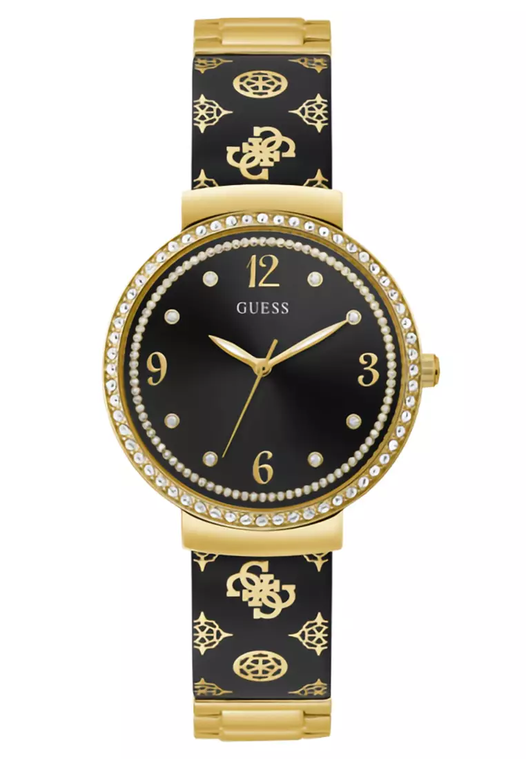 Desain dari GW0252L2 sangat menonjolkan kesan elegan dan modern yang sesuai dengan tren saat ini. Bagian dialnya didominasi motif hitam yang dipadukan dengan aksen warna metalik halus, menciptakan kontras yang menarik dan memberi tampilan yang sophisticated. Bentuknya yang bulat dan garis-garis yang bersih menambah kesan minimalis namun tetap berkelas. Logo GUESS yang terletak di bagian dial menambah sentuhan branding yang tidak berlebihan, memperkuat identitas merek tersebut.