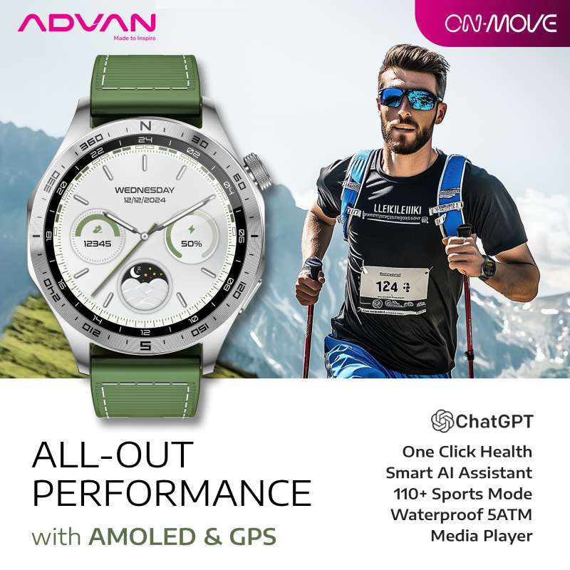 ADVAN Smartwatch On Move menampilkan desain yang modern dan minimalis, cocok untuk digunakan dalam berbagai aktivitas sehari-hari maupun olahraga. Bodinya yang ramping dan ringan membuatnya nyaman dipakai sepanjang hari tanpa merasa terbebani. Layar layar sentuh berukuran cukup besar dengan resolusi yang tajam memberikan tampilan yang jernih dan mudah dibaca, bahkan di bawah sinar matahari langsung. Pilihan bahan yang digunakan, seperti kaca tempered dan strap silikon berkualitas tinggi, menambah kesan elegan sekaligus tahan lama.